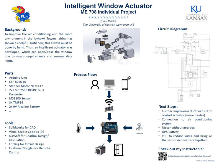 I developed a cloud-connected window actuator controlled by either sensor input or a mobile device. The system was built around an ESP8266 microcontroller, paired with an Arduino Uno. A stepper motor, in combination with a self-designed planetary gearbox (dimensioned in KISSsoft), was used to drive the window mechanism. I created the electrical schematics using Fritzing and implemented the control software in C++. Communication with Google Firebase enabled cloud-based control of the actuator.
